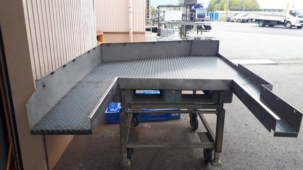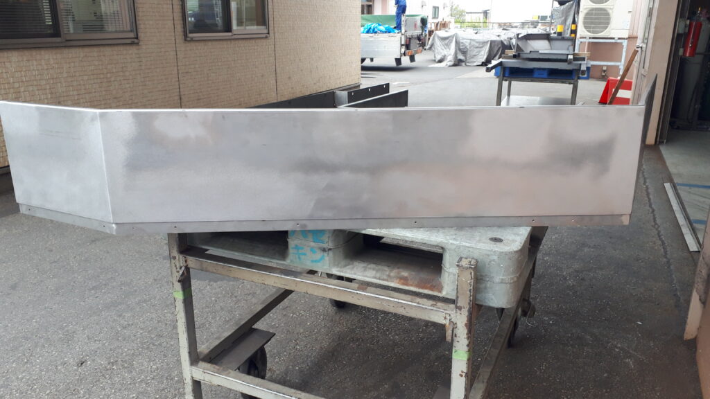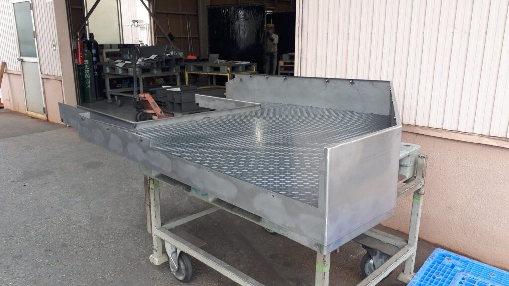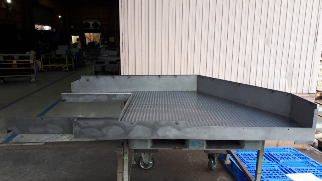 こちらの製品は、大型工作機械に使用されるオイルパンです。オイルがたまる部分であるため、漏れないように全周溶接を行うかコーキング処理が必要になります。全周溶接だと溶接箇所が広範になるため、コーキングにて油漏れがないように加工しています。また、オイルで滑りやすくなるので、板材は縞鋼板を使用して、滑りにくくなっています。側面の部分は、カバーになるため、仕上げをより丁寧に行っています。