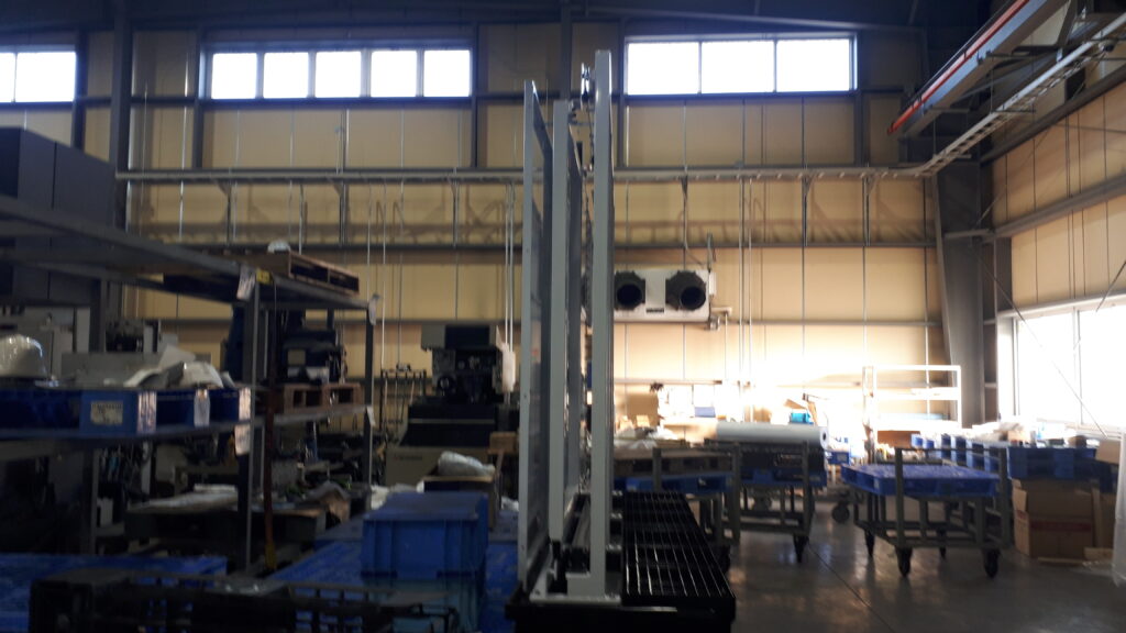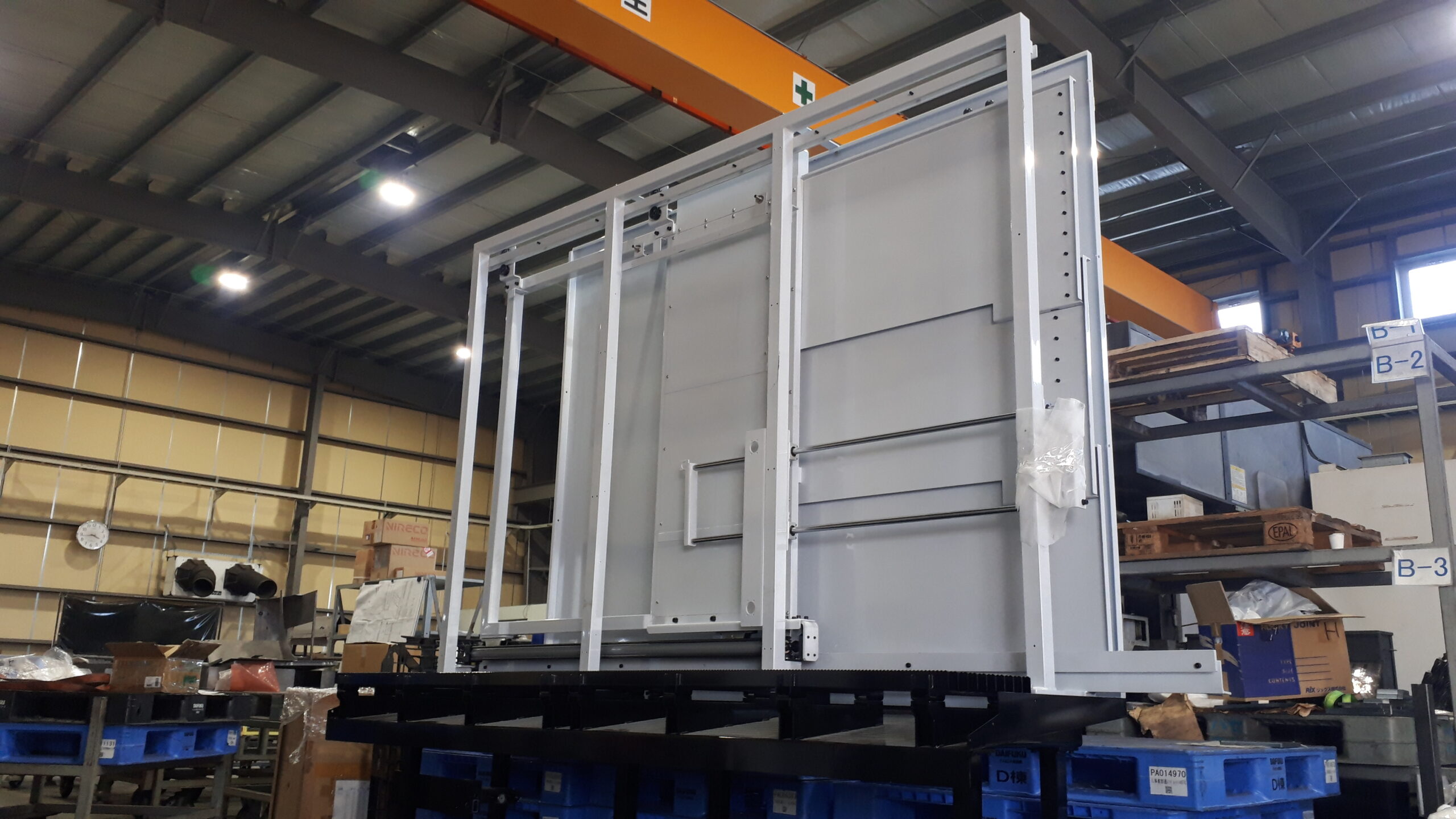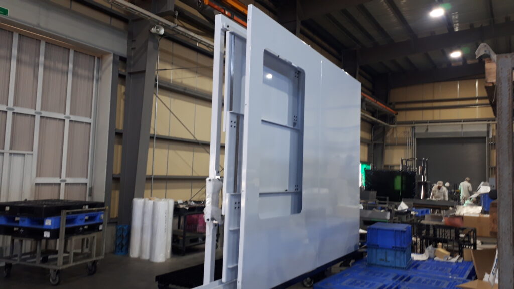 こちらの製品は、大型工作機械に使用される扉部分です。製作部品を約100点程組み合わせています。足場の部分に上部の扉部分を組み合わせるためにクレーンで吊り上げて設置します。他にもセンサー・シリンダーや配管配線も取り付けます。加工面では、扉を組み立てる際に穴位置にズレがあるとボルトが閉まらないので、穴位置の精度が重要になります。公差は、穴位置が±0.2mm、歪み±1mmの精度が必要です。大型のため、移動や組立に時間を要しますが、正常に動作することを確認しながら組立を行い完成です。