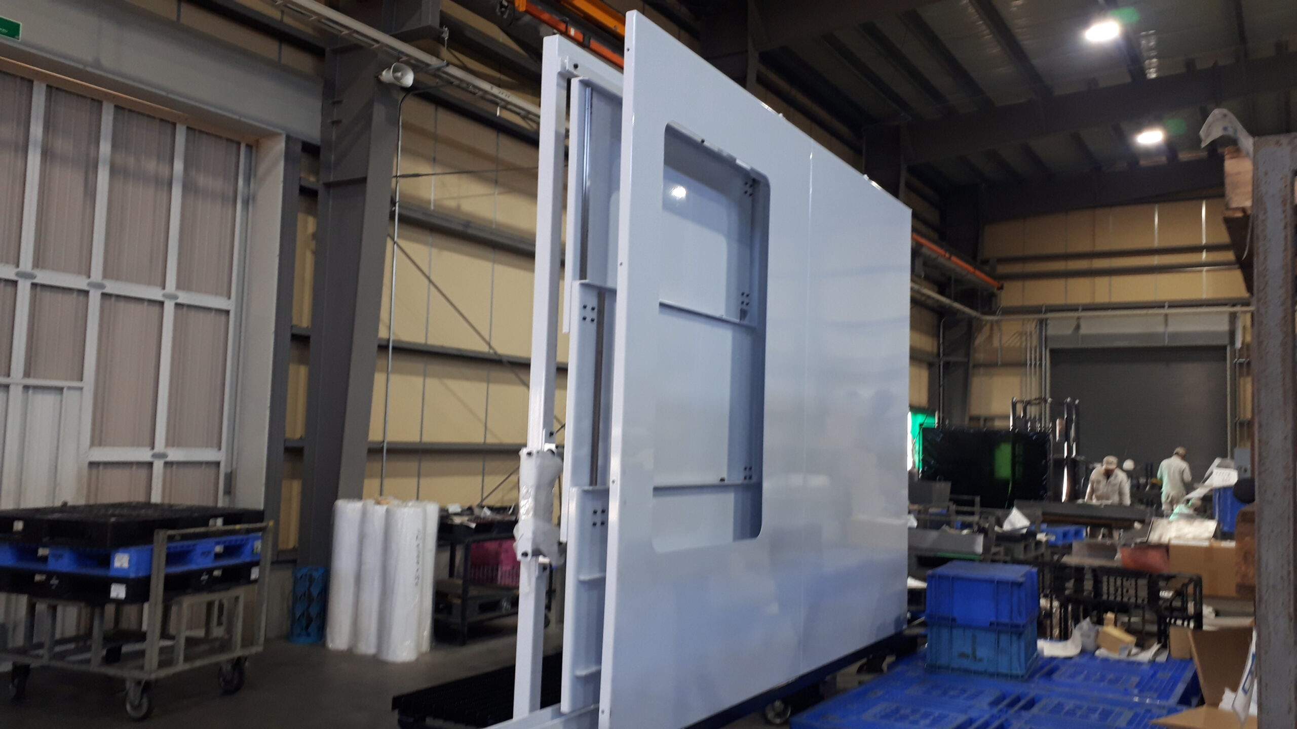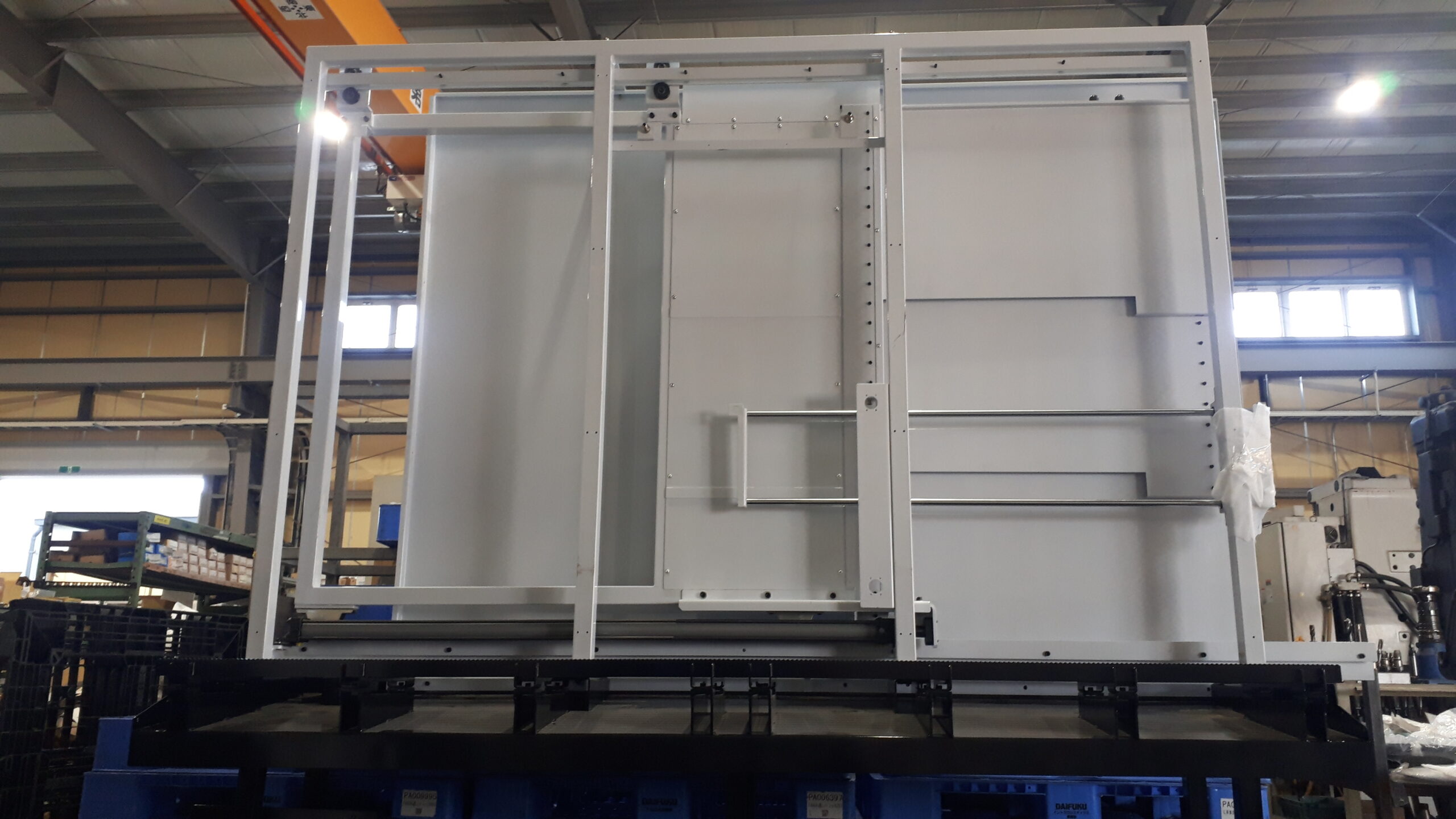 こちらの製品は、大型工作機械に使用される扉部分です。製作部品を約100点程組み合わせています。足場の部分に上部の扉部分を組み合わせるためにクレーンで吊り上げて設置します。他にもセンサー・シリンダーや配管配線も取り付けます。加工面では、扉を組み立てる際に穴位置にズレがあるとボルトが閉まらないので、穴位置の精度が重要になります。公差は、穴位置が±0.2mm、歪み±1mmの精度が必要です。大型のため、移動や組立に時間を要しますが、正常に動作することを確認しながら組立を行い完成です。