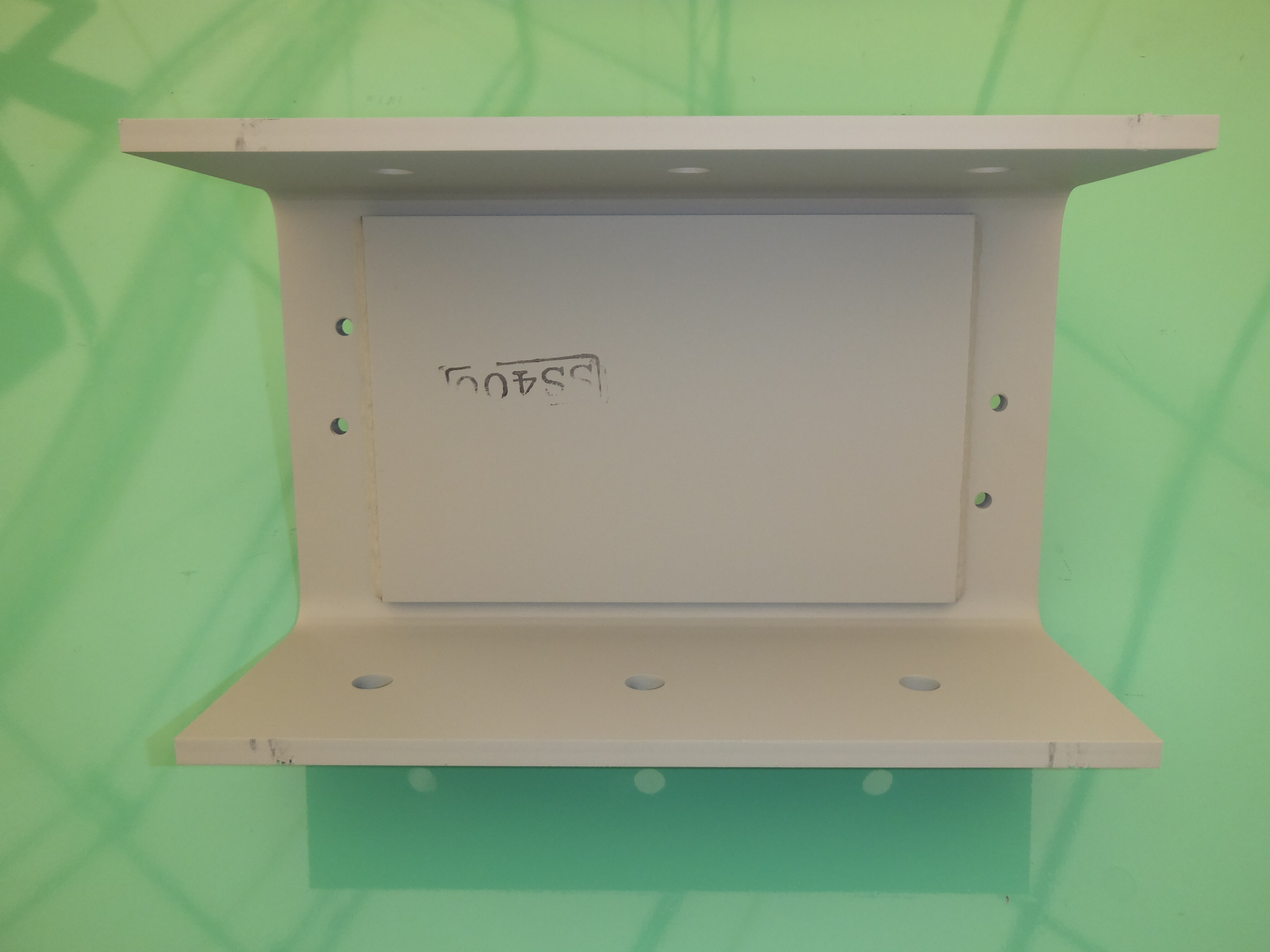 この昇降機用ブラケットは、昇降機のカウンターウエイトのシーブ付近に使用される溶接板金部品です。板厚9mmのコの字曲げ溶接ブラケット部品の内寸法には、公差±1mmが設けてあります。また、内側には12.0mmのプレートを半自動溶接しています。この溶接の時、溶接脚長が6mm以上になるように溶接しています。この溶接ブラケットは昇降機用に使用され強度が必要なため、上部のプレートは、19.0mmを使用して強度が強いブラケットになるようにしています。